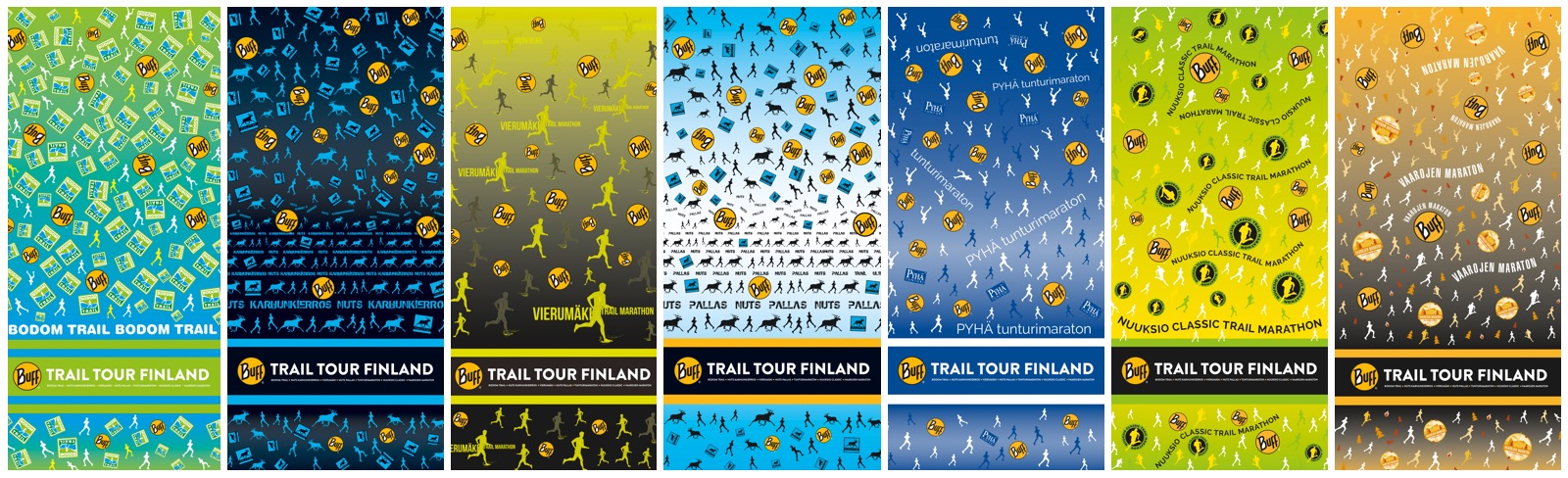 BUFF Trail Tour Finland -osakilpailujen Touriin kuuluvien matkojen osanottajille on tänäkin vuonna luvassa upeita Buff-huiveja. Huivit on suunnitellut viimevuotiseen tapaan Bodom Trailin ja Nuuksio Classicin järjestelytiimiin kuuluva Kari Koskinen. Tässä tuo komea kokoelma kisakalenterin mukaisessa järjestyksessä (klikkaa suuremmaksi):